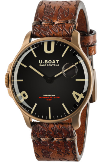 U-BOAT Darkmoon-malliston vie Capsulo-mallistosta tutun rakenteen askeleen pidemmälle, avaruuteen ja kuun pimeälle puolelle. U-BOAT DARKMOON 44MM BLACK IP BRONZE / LEATHER STRAP 8467-kellon sveitsiläinen Rondan 712.3-koneisto on täysin upotettu alhaisen viskositeetin öljyyn, ja mikä antaa kellotaululle syvyyden vaikutelman ja kirkastaa kellotaulun parantaen luettavuutta. Syvyyden vaikutelman viimeistelee taulussa oleva ilmakupla, joka liikkuu taulussa ranteen liikkuessa ja näyttää kuin koko kello olisi veden alla. Syvyydessä mustaa pohjaa vasten loistaa hätkähdyttävän suuret beiget superluminova-käsitellyt indeksit ja viisarit, ja lasi on naarmuuntumaton kupera safiirilasi. 44 mm leveä teräsrunko on valmistettu ASTM International AISI-standartoidusta kirurginteräksestä, ja pinta on IP-käsitelty, mikä antaa rungolle kauniin pronssisen pinnan. Ranneke on artisaanikäsiteltyä, laserkuvioitua vasikannahkaa. Kellon käyttölämpötila on 0-60 celsiusastetta, eikä kelloa tule jättää kauaksi aurinkoon.