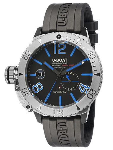 U-BOAT SOMMERSO BLUE 9014 on klassinen Italo Fontanan Sommerso-mallistoon kuuluva sukeltajankello sini-mustalla värimaailmalla. Kellossa on 26 jalokivellä varustettu 38 tunnin käyntivaran koneisto, 300 m vesitiiviys ja pyörivä kellokehä. Suuri 46 mm leveä runko on valmistettu AISI-standartoidusta kirurginteräksestä ja viimeistelty satiinihionnalla. Kellon ominaisuuksiin kuuluu luminoidut siniset viisarit ja indeksit, sekä 24 tunnin kello ja päivyri. 22 mm leveä ranneke on valmistettu kestävästä vulkanoidusta kumista, ja kokonaisuuden viimeistelee heijastamatomalla pinnalla varustettu safiirilasi.