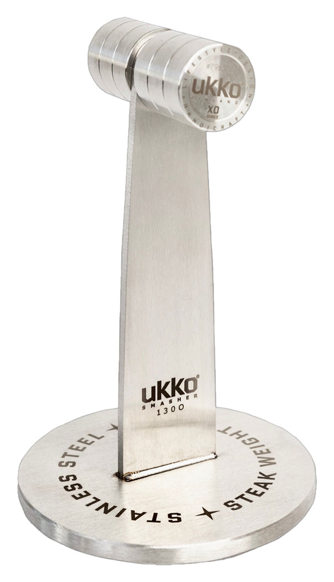 Ukko Smasher 1300 + Smoky Whisky RUB on suomalaisten sorvareiden taidonnäyte, jolla valmistat maailman parhaat pihvit grillissä tai valurautapannulla. Se on valmistettu sorvaamalla ja hitsaamalla 100%:sta elintarviketerästä (AISI304). Ukko Smasherin kokonaispaino on 1,3 kg, jonka sorvattu umpiteräksinen kahva (390 gr) takaa tukevan otteen eikä kuumene käytössä. Täydellisen lopputuloksen takaa prässin sileäksi hiottu pohjaosa (700 gr), joka litistää pihvilihan, tehden pihvistä täydellisen. Kiekon halkaisija on 120 mm ja 8 mm paksu. Ukko Smasher 1300 on konepestävä.