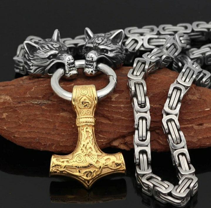Varia Design Wolves kulta -kaulakoru on valmistettu hopean- ja kullanvärisestä ruostumattomasta teräksestä. Kaulaketjun pituus on 60 cm ja paksuus 7 mm. Riipuksessa on 45 x 32 mm kokoinen Thorin vasara. Riipuksesta pitävät kiinni sekä Freki että Geri, Odinin kaksi sutta. Koru painaa noin 160 grammaa. Varia Design -korut toimitetaan valmistajan alkuperäisessä pakkauksessa.