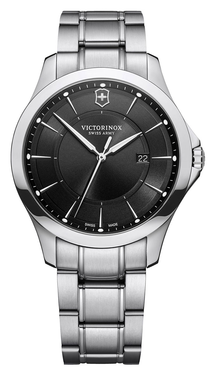 Victorinox Alliance 241909 on tyylikäs miesten rannekello, jonka 40 mm leveä ja 10 mm paksu hopeanvärinen runko on valmistettu ruostumattomasta teräksestä. Runkoon kiinnittyy hopeanvärinen ruostumaton teräsranneke, jonka leveys kiinnityskohdasta on 21 mm. Safiirilasin alla suojassa on musta kellotaulu, jossa päivyri kello kolmessa. Victorinox 241909 kuuluu vesitiiviysluokkaan 100m / 10atm eli se on vesitiivis. Soveltuu pintauintikäyttöön ja snorkkelisukellukseen, ei laitesukellukseen. Victorinox-kelloille myönnetään viiden vuoden takuu ja ne toimitetaan valmistajan alkuperäisessä pakkauksessa.