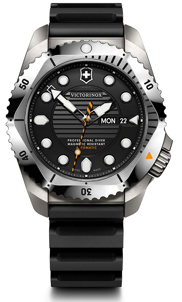Victorinox Dive Pro Automatic 242070 on tinkimätön työkalu sukeltajille ja kelloentusiasteille, jotka arvostavat teknistä ylivertaisuutta ja taktista ulkoasua. Hiekkapuhallettu musta titaanirunko ja siihen sointuva musta kumiranneke tekevät tästä kellosta kevyen, kestävän ja äärimmäisen tyylikkään. Tämä ISO 6425 -sertifioitu ammattilaiskello on suunniteltu kestämään kovaa painetta ja vaativia olosuhteita syvyyksissä.