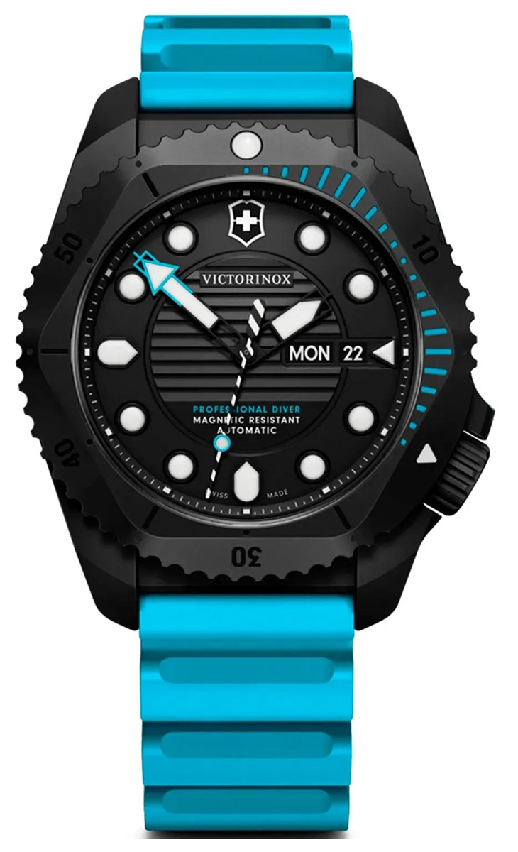 Victorinox Dive Pro Automatic 242071 on suunniteltu niille, jotka vaativat kelloltaan ehdotonta suorituskykyä veden alla ja tyylikästä presenssiä maalla. Tämä ISO 6425 -sertifioitu ammattilaistason sukeltajankello yhdistää hiekkapuhalletun mustan titaanirungon ja sähköisen turkoosinsinisen kumirannekkeen. Se on kello, joka tarjoaa tarkan kontrollin ja mielenrauhan syvyyksissä, missä jokainen sekunti merkitsee.