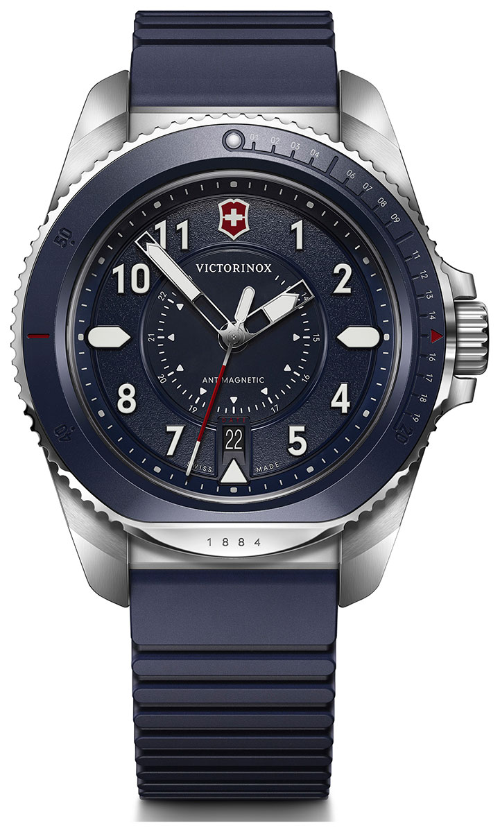 Victorinox Journey 1884 241975 miesten kellon antimagneettinen suoja turvaa kvartsikelloa ympäristössä olevan sähkön aiheuttamilta epätarkkuuksilta. Tämä yhdistettynä sisäänrakennettuun iskunkestoon ja laadukkaaseen kumirannekkeen monipuoliseen ja mukavaan käyttöön tekevät siitä ihanteellisen kumppanin missä tahansa. Tummansinisen kumirannekkeen leveys kiinnityskohdasta on 21 mm ja se on helposti vaihdettavissa ilman työkaluja. Kellon runko on valmistettu ruostumattomasta teräksestä ja se on leveydeltään 43 mm ja paksuudeltaan 12 mm. Naarmuuntumaton safiirilasi suojaa tummansinistä kellotaulua, jossa on päivyri klo 6 kohdalla sekä luminoidut osoittimet ja indeksit kellotaulun helppoa lukemista varten pimeässä. Kellon kokonaispaino on 120 grammaa ja se kuuluu vesitiiviysluokkaan 200m / 20atm, joten se soveltuu uintiin ja laitesukellukseen.
