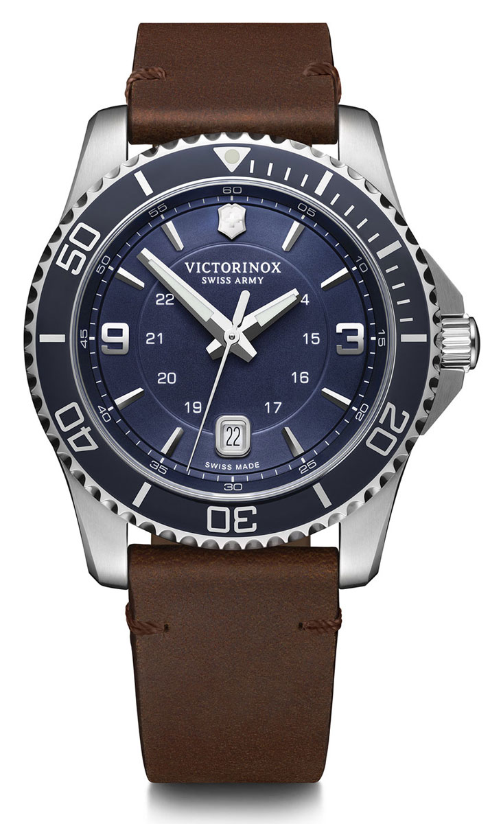 Victorinox Maverick Large 241863 on tyylikäs miesten rannekello, jonka 43 mm leveä ja 11 mm paksu hopeanvärinen runko on valmistettu ruostumattomasta teräksestä. Runkoon kiinnittyy ruskea nahkaranneke, jonka leveys kiinnityskohdasta on 22 mm. Safiirilasin alla suojassa on sininen kellotaulu, jossa päivyri kello kuudessa. Victorinox 241863 kuuluu vesitiiviysluokkaan 100m / 10atm eli se on vesitiivis. Soveltuu pintauintikäyttöön ja snorkkelisukellukseen, ei laitesukellukseen. Victorinox-kelloille myönnetään viiden vuoden takuu ja ne toimitetaan valmistajan alkuperäisessä pakkauksessa.