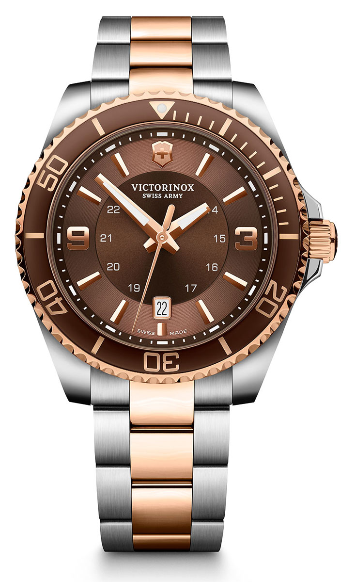 Victorinox Maverick Large 241951 on tyylikäs miesten rannekello, jonka 43 mm leveä ja 11 mm paksu hopeanvärinen runko on valmistettu ruostumattomasta teräksestä. Runkoon kiinnittyy kaksivärinen ruostumaton teräsranneke, jonka leveys kiinnityskohdasta on 22 mm. Safiirilasin alla suojassa on ruskea kellotaulu, jossa päivyri kello kuudessa. Victorinox 241951 kuuluu vesitiiviysluokkaan 100m / 10atm eli se on vesitiivis. Soveltuu pintauintikäyttöön ja snorkkelisukellukseen, ei laitesukellukseen. Victorinox-kelloille myönnetään viiden vuoden takuu ja ne toimitetaan valmistajan alkuperäisessä pakkauksessa.