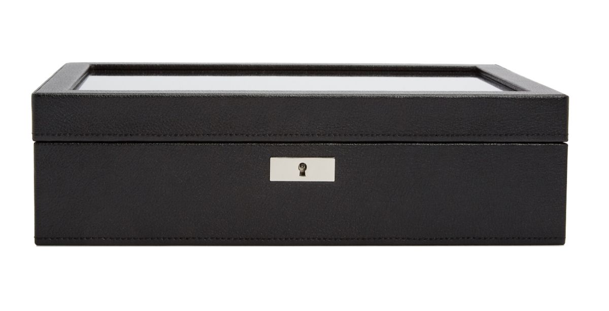 WOLF Viceroy 10:n kellon kellolaatikko 466102 sisältää kauniisti kuvioidun vegaanisen nahkapinnan, ja hopeanvärisen, kuvioidun silkkivuoren, joka pitää kellosi naarmuuntumattomana. Kellolaatikossa on tilaa yhteensä kahdesalle kellolle, ja kellorasia on mahdollista lukita avaimella. Lasikannen läpi on mahdollista nähdä rasian sisään yhdellä vilkaisulla, ikä helpottaa pukeutumista. Lisäksi kello sisältää USB-portin älykelloille. Kellolaatikon koko on 32.7 x 22.9 x 9.5 cm ja paino on 2,49 kg.