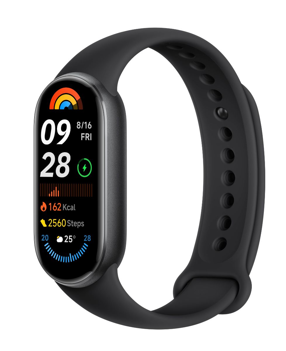 Pakkaus sisältää Xiaomi Smart Band 9 Midnight Black -aktiivisuusrannekkeen, käyttöohjeen ja magneettisen laturin.